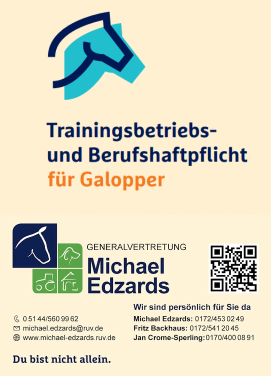 To ensure the best protection for your training operation and racehorses, we recommend purchasing the training and professional liability insurance from Mr. Michael Edzards at R+V Versicherung. Contact Mr. Edzards today to discuss your specific needs and receive a personalized quote. Your safety and the safety of your horses are our top priority.